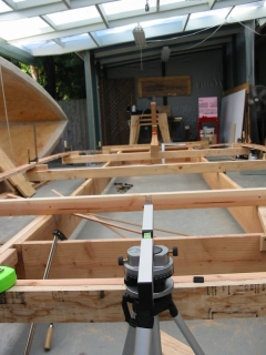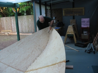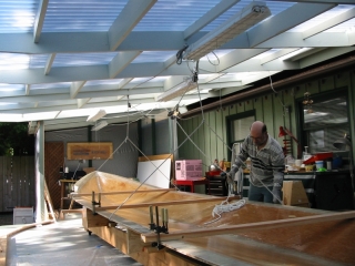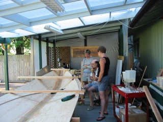 You may notice the 32oz biaxial glass around the perimeter covering the chine flats. This seemed like a good idea at the time. Later it turned out to make the fitting of the sides more difficult. As usual, the book has more foresight than a first time builder. |
