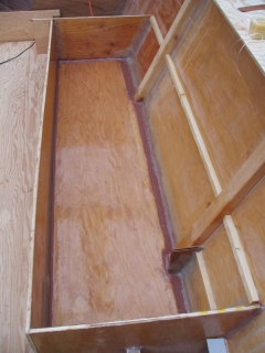 Decided the boat needed a proper chain locker and the front few feet weren't in use. This is the bottom of the locker and the white things in the corners are temporary wood pegs in the drain holes. |
