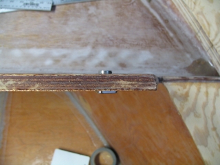 Above is how I figured out where to drill the drain holes. The two silver things on opposite sides of the plywood are very strong magnets that follow each other around. I was on the inside and Anne was outside the hull and as I moved the magnet on the inside to where I thught the hole should be, she could tell from the magnet on the outside of the hull if it was in a good place. The plan was to have the holes above the chine flats and tilted down and aft. I hope this will minimize the water coming in the bottom of the locker. |