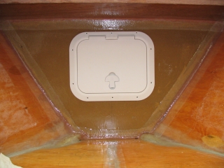 Bulkhead -- Now glassed-in with the waterproof (and more importantly smell proof) hatch in place. |