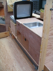 The galley is going to be simple, with a sink, ice box, and storage. The stove will be portable and the area behind the sink is a dry bin with the door shown propped up. The icebox will have no drain and will have a lid on top with a hinge in the middle allowing access the the front or rear. So far, there is not going to be an overboard sink-drain or large water tank, just 3-gallon containers for water and grey water under the sink. |