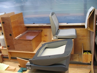 To port , there is a hanging locker aft and a seat box with storage under. The forward "Admiral's Command Chair" is on a box that slides aft to allow standing at the bulkhead or forward 1/2 way to sit facing forward. The box can also slide all the way forward to allow the seat to face aft at the imaginary table. Batteries sit in the footrests on both sides (yellow). Lots of parts cut out, not much finished. Yes Bruce, there is varnish - don't tell the others. |